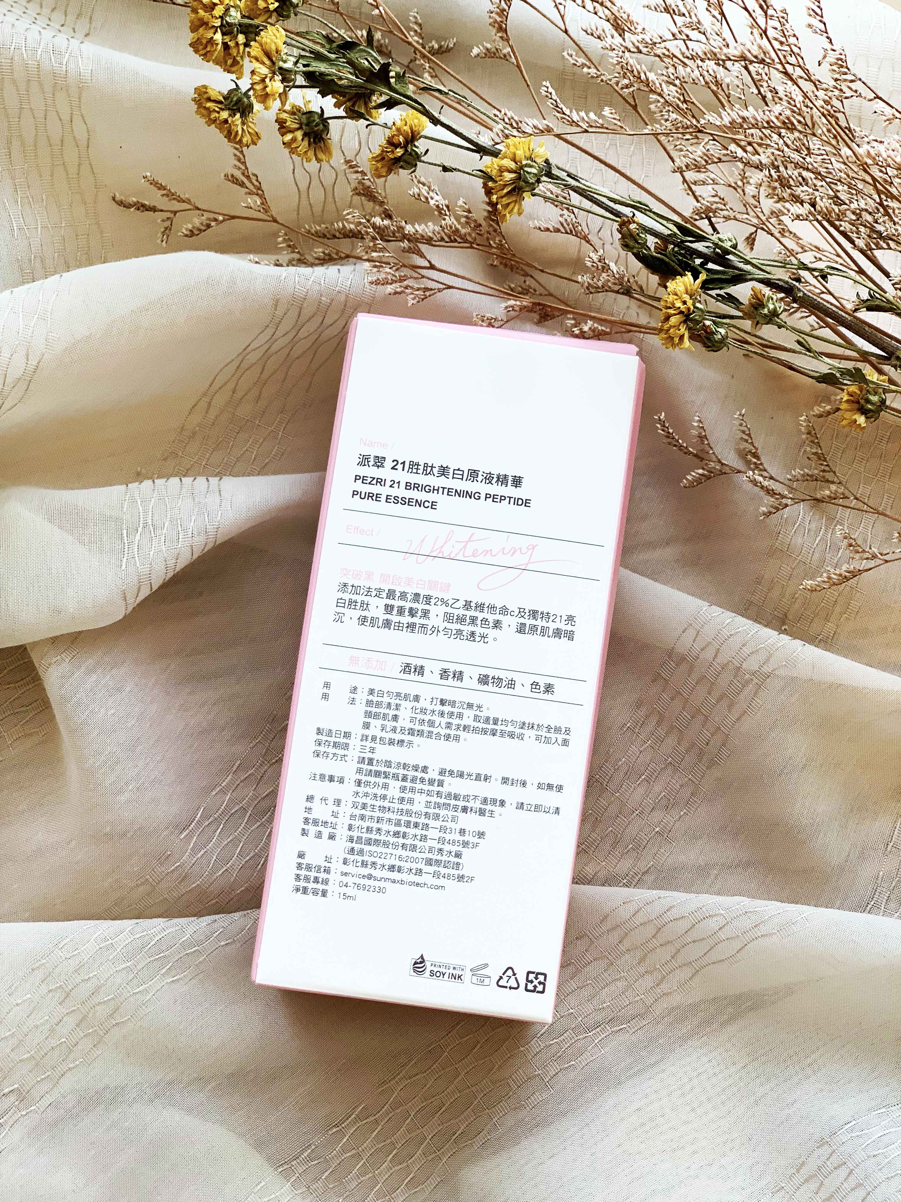 - 獨特21亮白胜肽:是PEZRI自行開發的獨特胜肽成分,從根本阻絕黑色素形成,淨白肌膚改善暗沉