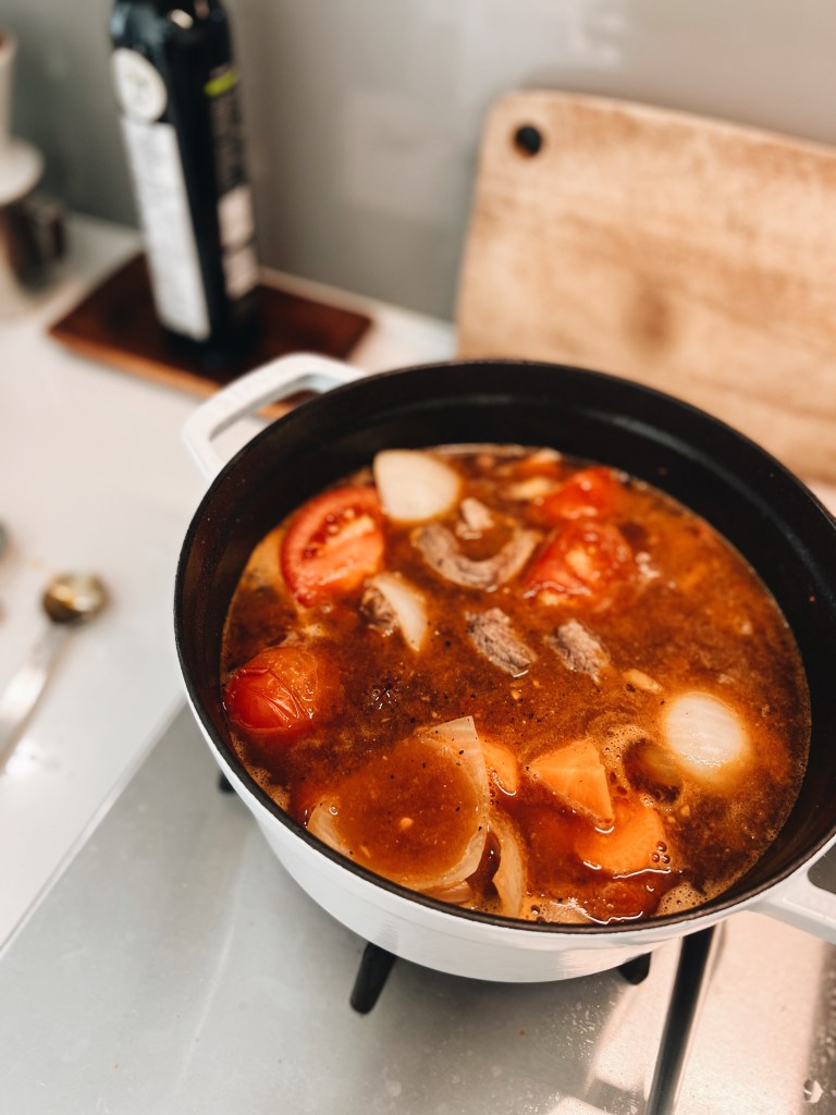 全部炒一炒,加水燉(淹過材料隨時補水),燉1.5小時,最後加調味料(醬油豆瓣醬不算)跟灑蔥花完成。
