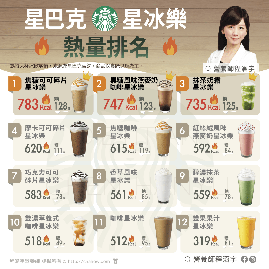 這次整理了星巴克所有星冰樂的熱量排行