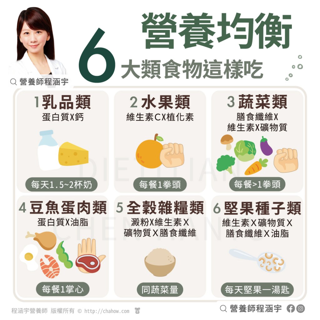 每日由飲食中獲得足夠量的身體所需每種營養素, 且吃入與消耗的熱量達到平衡,六大類食物提供不同的營養素,每類食物都要吃到建議量,才能達到均衡。