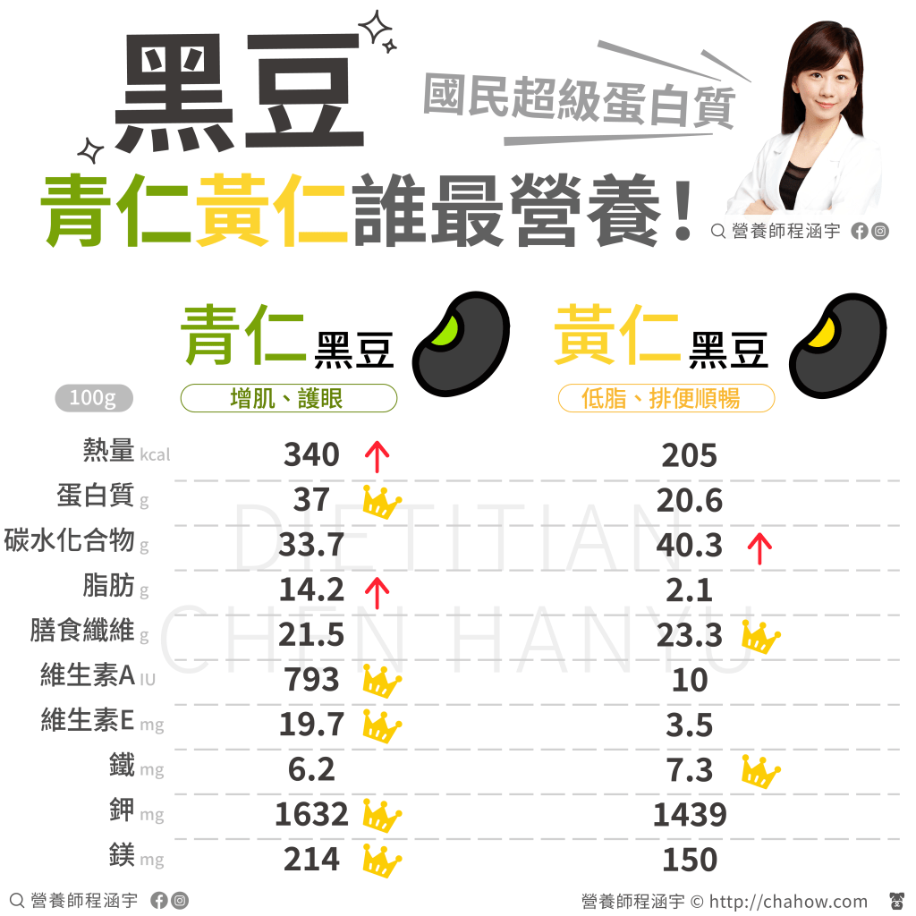 •熱量較青仁黑豆低,蛋白質只有青仁黑豆的56%,脂肪低至2.1g/100g,碳水化合物比青仁黑豆多!